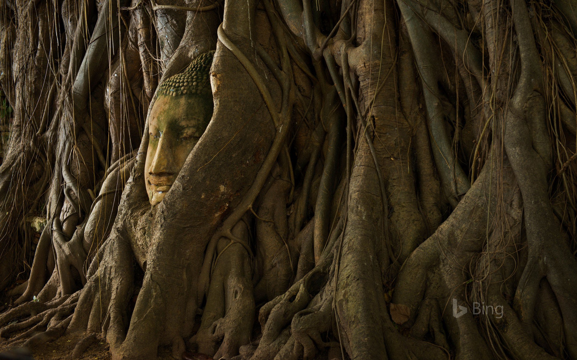 Previous Image Next Image A statue of a Buddha head in the roots of a tree, Ayutthaya, Thailand Stone Buddha head in the roots of a tree – Ayutthaya, Thailand (Bing)